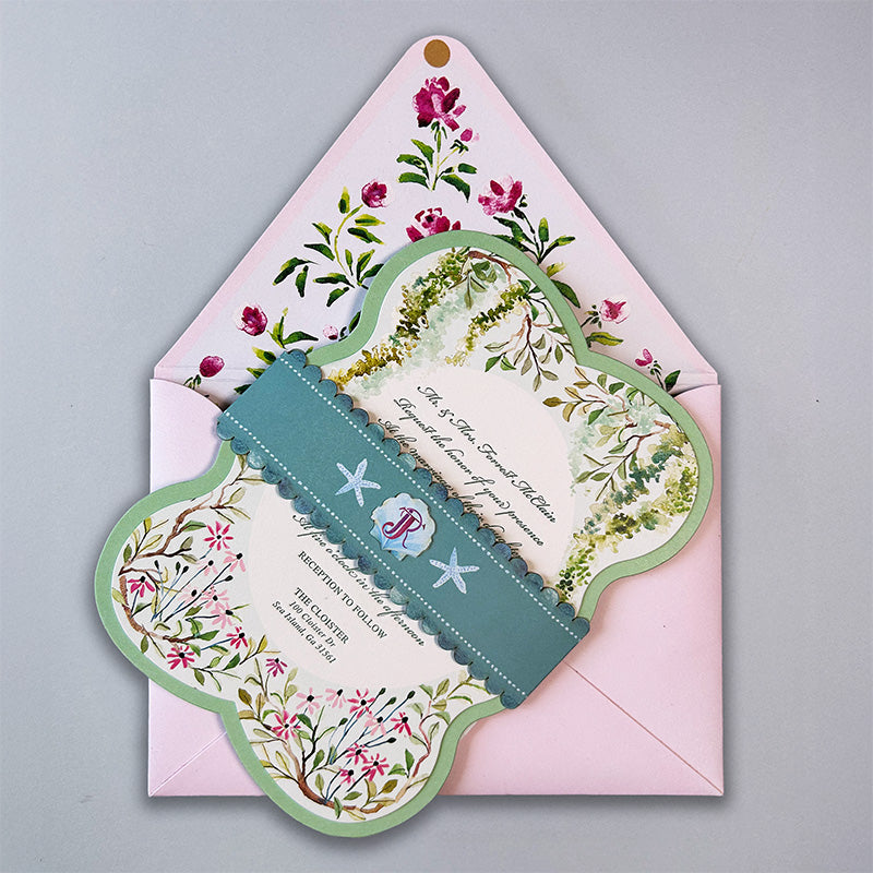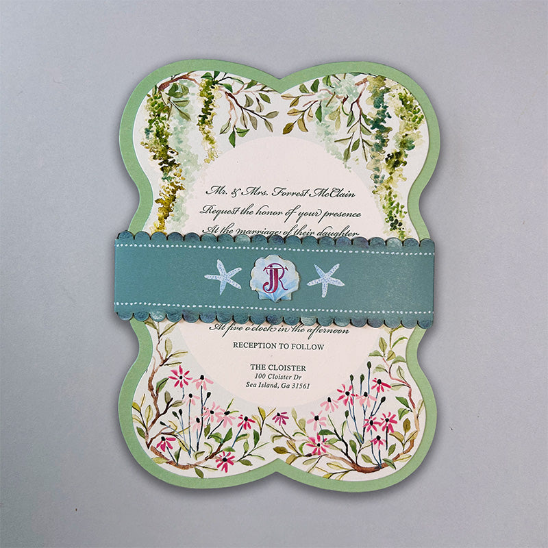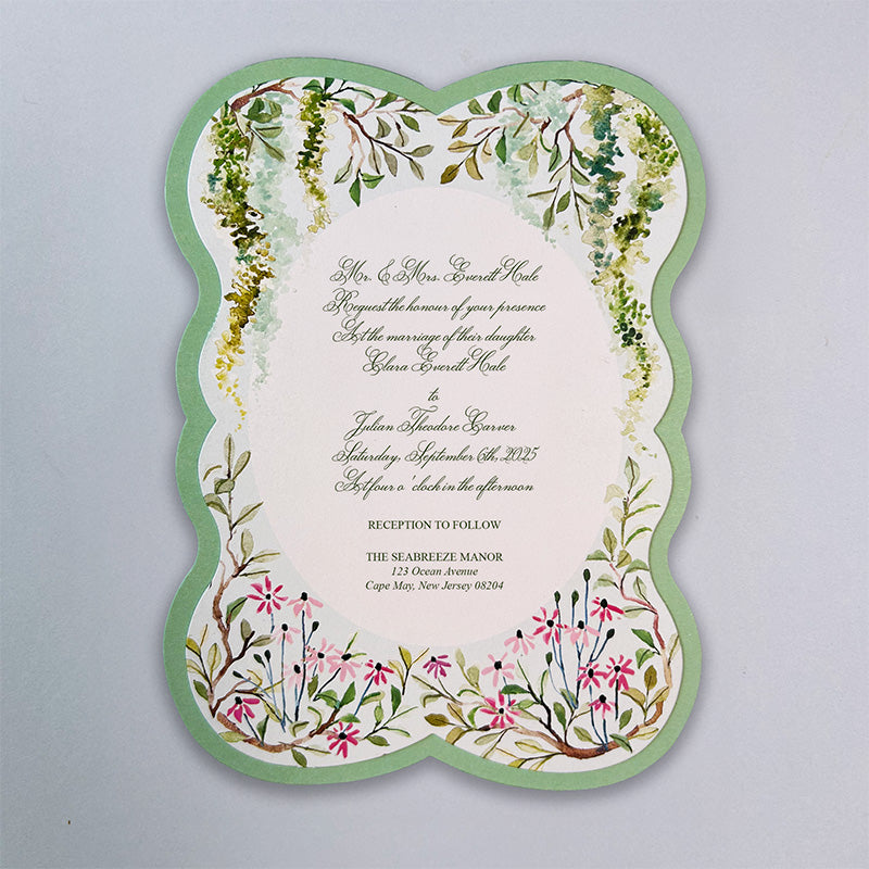 • Main invitation: A5 printed on 640gm2 paper, includes up to one facet with letterpress or foiling.
